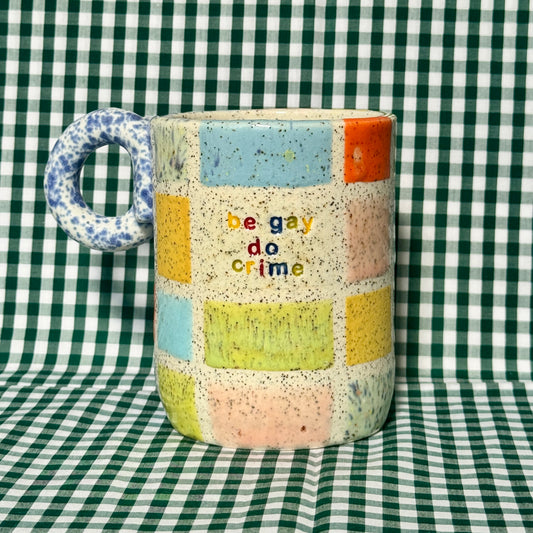 Be Gay Do Crime Mug - rainbow gingham